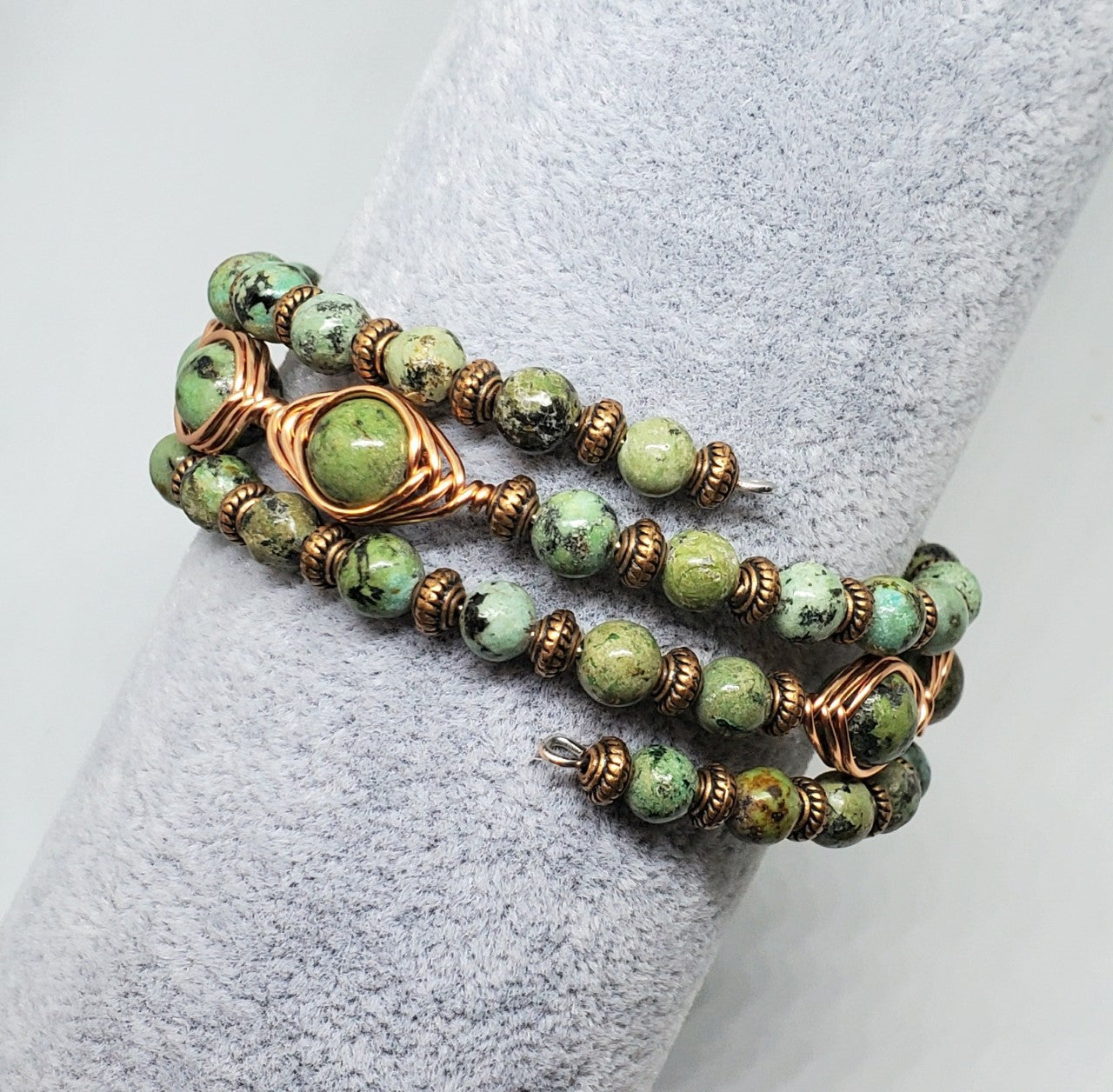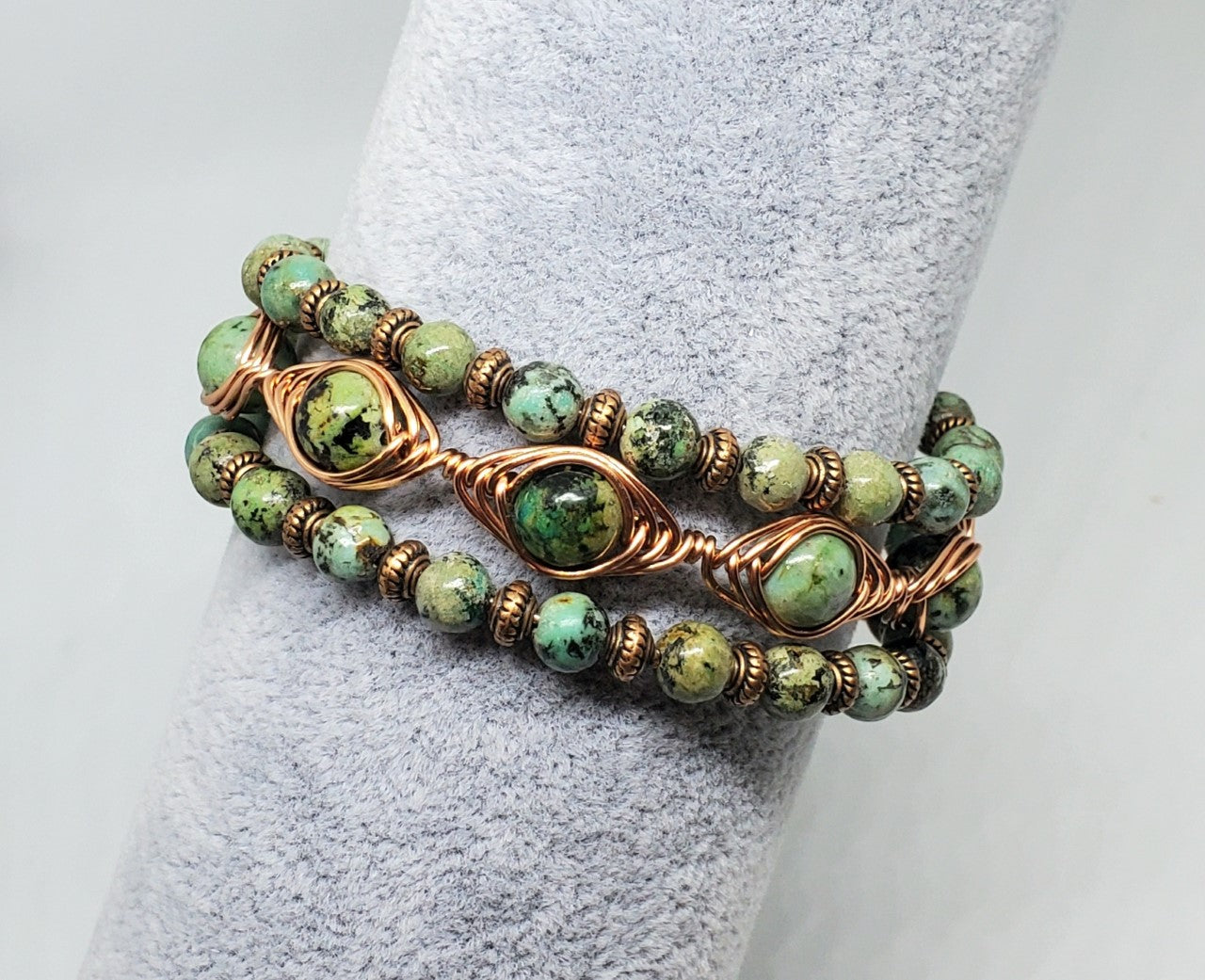 African Turquoise stones are blends and shades of green, blue, black and lighter colors framed in the copper wire herringbone design. The center loop has 8mm semi precious gemstones in an elegant design bordered by a loop of 6mm sodalite beads alternates with copper spacer beads on both sides.