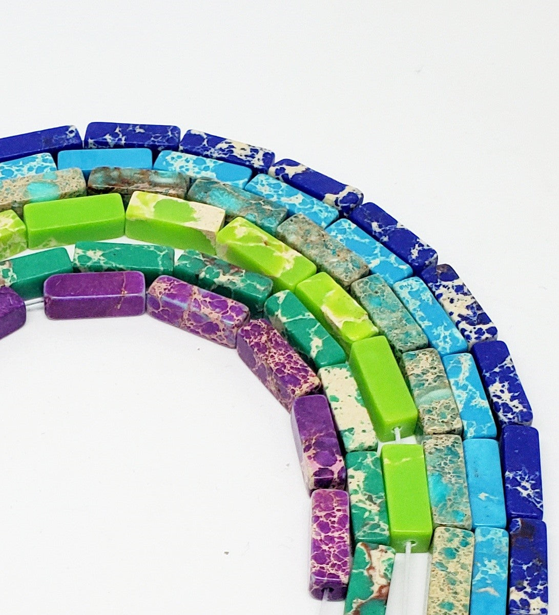 The multi-color photo shows: Dark blue= top, outer strand, Blue- 2nd one from top, Aqua = 3rd one from top, Lime Green = 4th from top, Green = 5th from top, Purple= 6th from top/bottom inside strand,
