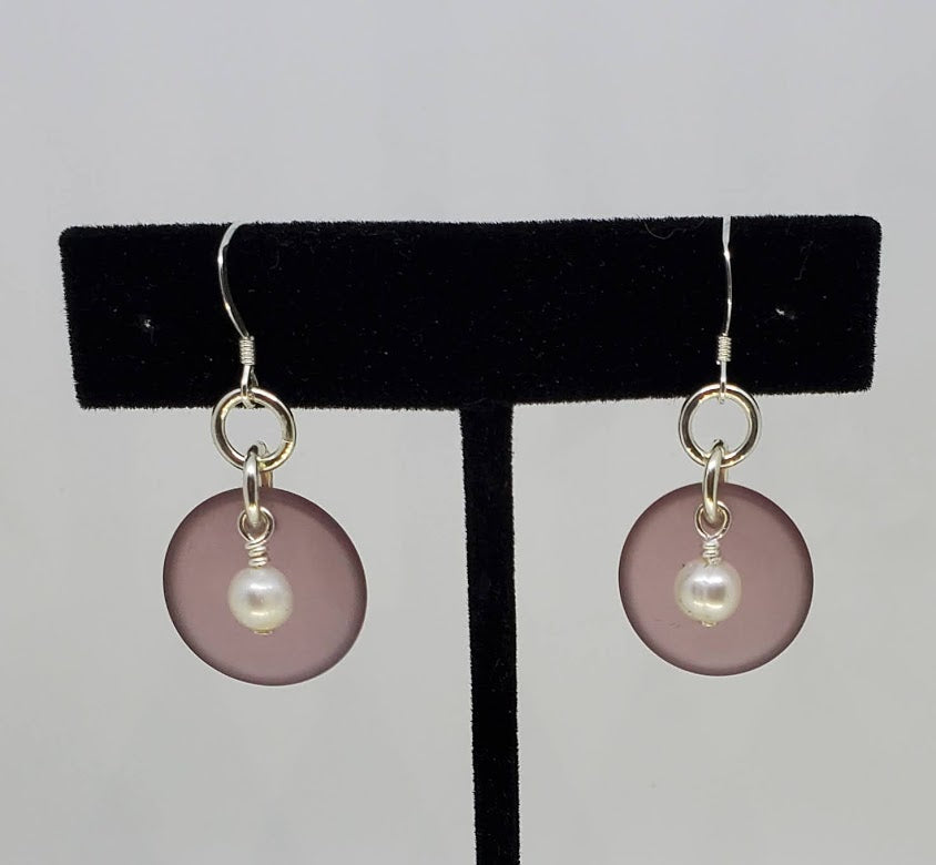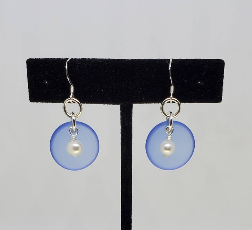 Puffed Coin shape man-made Sea Glass, approx. 1 inch in diameter with a 5.5 mm Fresh Water Pearl. Sterling Silver jump rings, wire and Ear Wires with a stopper to prevent them from falling out of your earlobe.