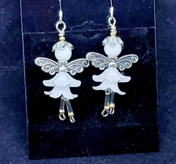 White Lucite flowers, white glossy glass bead, and silver colored wings and hat are used to create these little fairies.