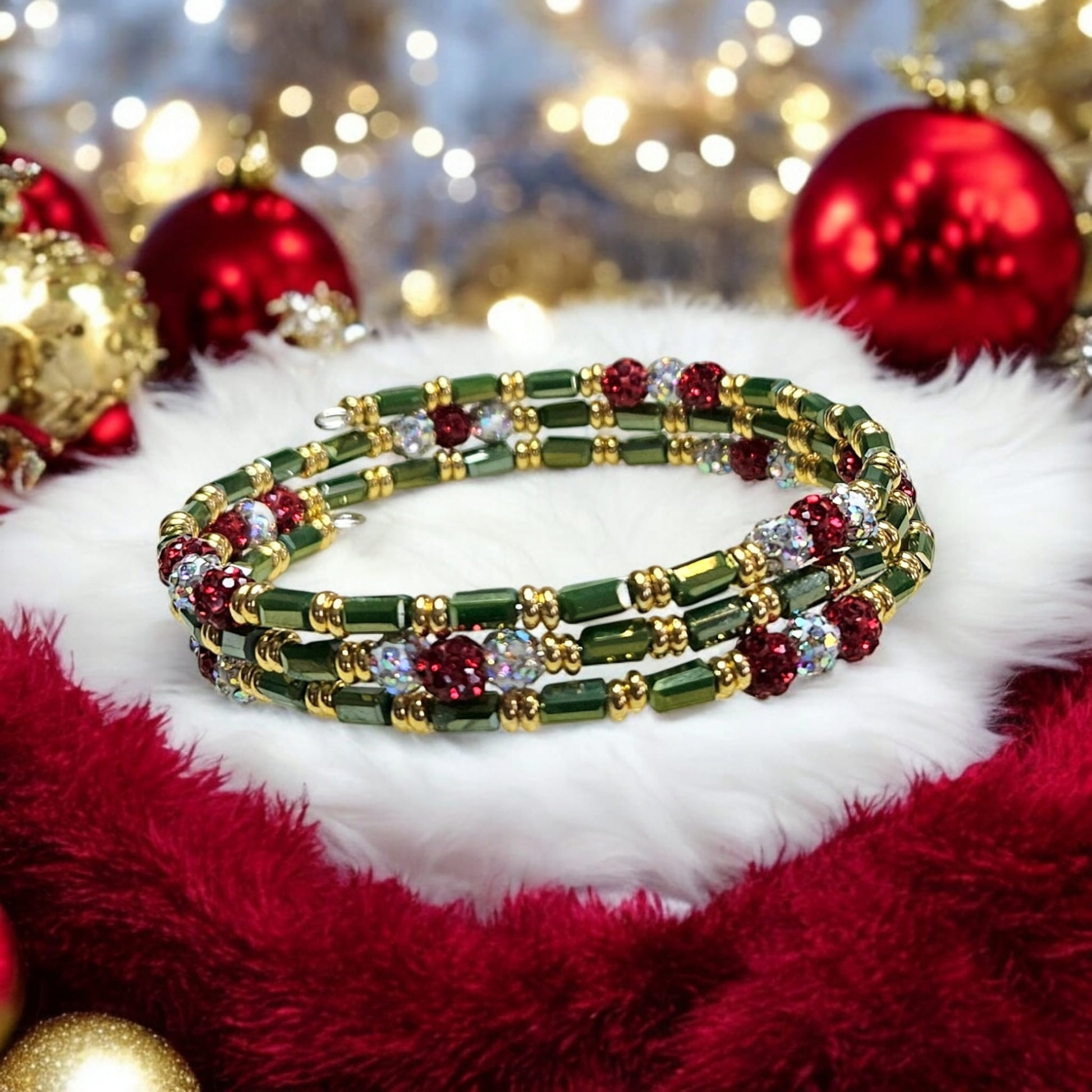 Made with 3 tiers of memory wire so no hassles with a clasp, just wrap it around your wrist. Very comfortable to wear. Mostly glass beads with crystal embedded clay disco style balls.