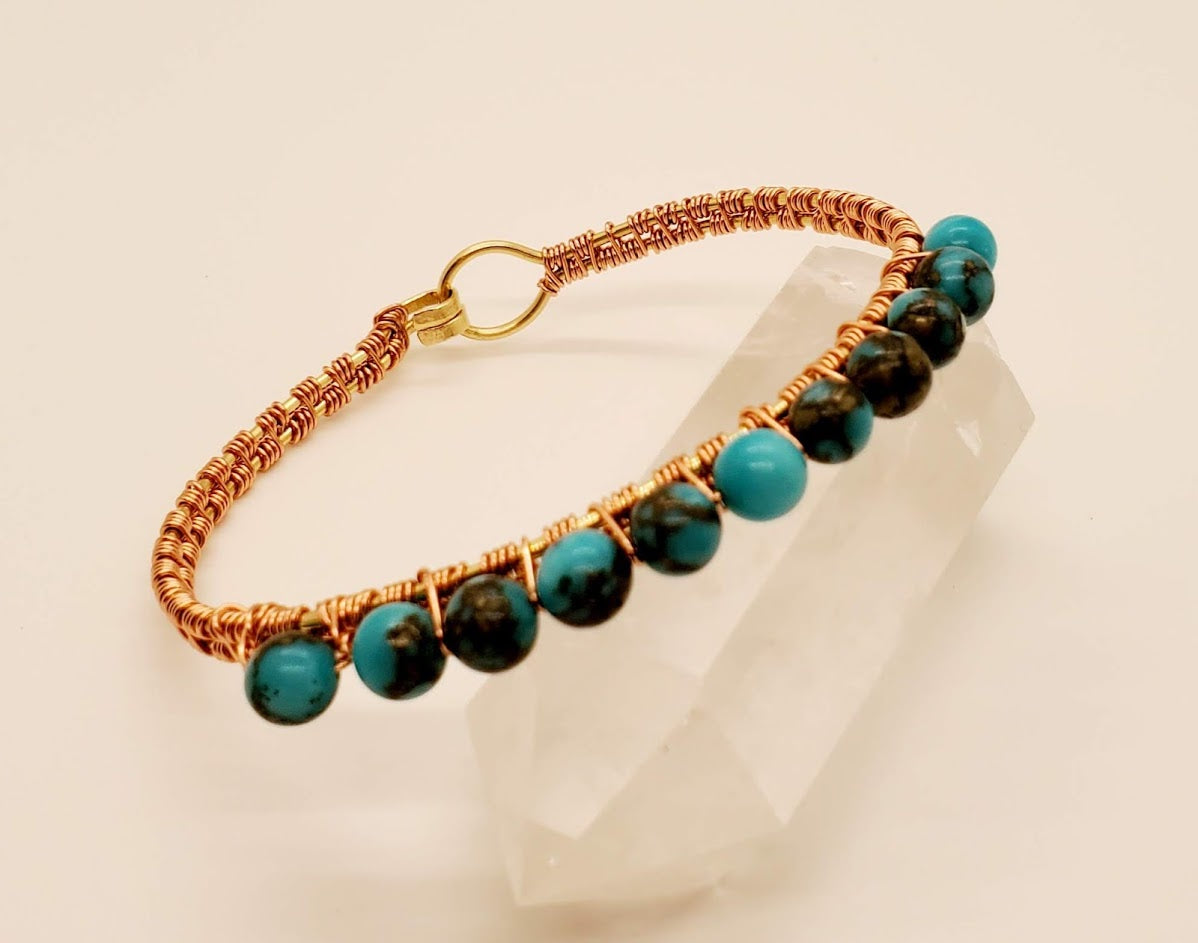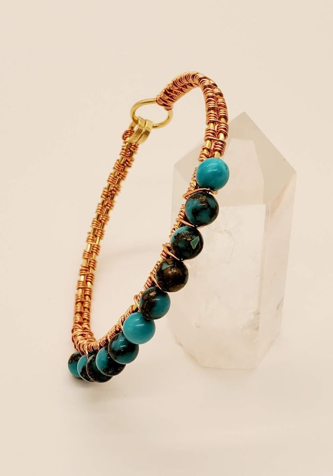 Materials: 16 gauge brass wire base, 22 gauge copper wire weave with Turquoise & Pyrite beads.